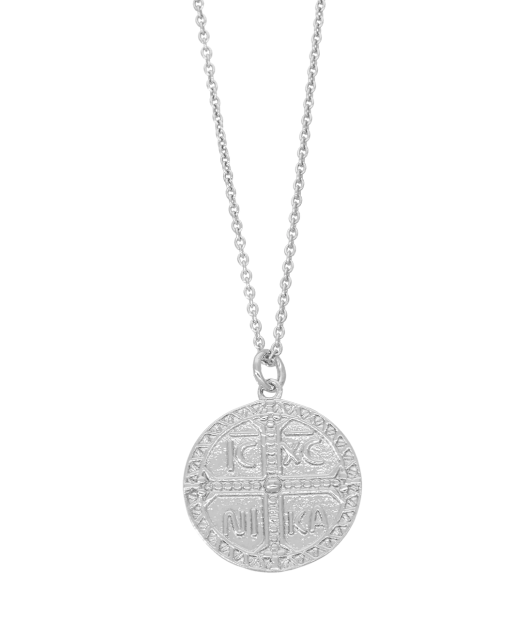 Halskæde i sølvlook med møntformet vedhæng dekoreret med fine detaljer og historisk præg. Et smykke med et råt og samtidig elegant udtryk, som kan styles alene eller sammen med andre kæder for et lag-på-lag look. Ideel til enhver smykkesamling.