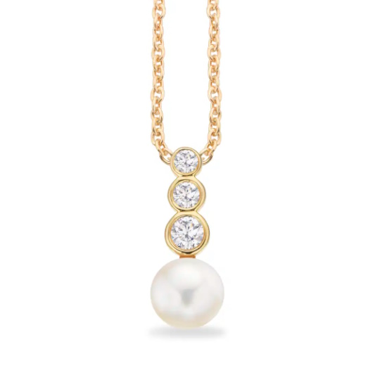 Denne halskæde fra Scrouples har et vedhæng i 8 karat guld, prydet med tre zirkonia sten og en ferskvandsperle. Kæden er sølv forgyldt, hvilket fuldender det elegante design.