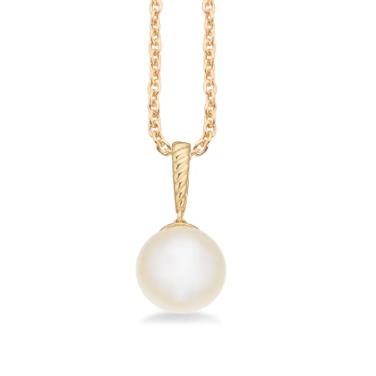 Denne elegante halskæde fra Scrouples har en forgyldt sølv kæde, der fremhæver en smuk ferskvandsperle. Vedhænget er udført i 8 kt guld, hvilket tilføjer et strejf af luksus og varme til designet. Kombinationen af den skinnede perle, det gyldne vedhæng og den forgyldte kædeskaber et tidløst smykke, der er perfekte til både hverdagsbrug og særlige lejligheder.