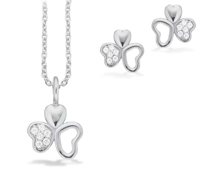 Smykkesættet fra Scrouples er fremstilet i sølv og består af en halskæde og ørestikker. Hvert smykke er designet med tre små hjerter, hvoraf et er prydet med funklende zirkonia sten, hvilket gør det til en fin gave.